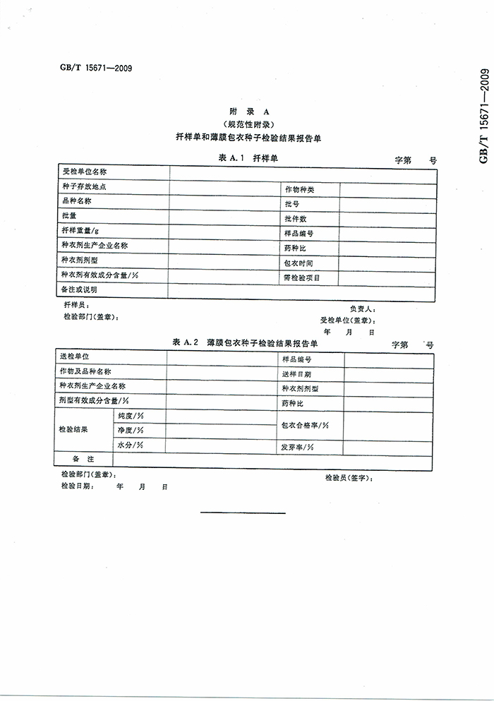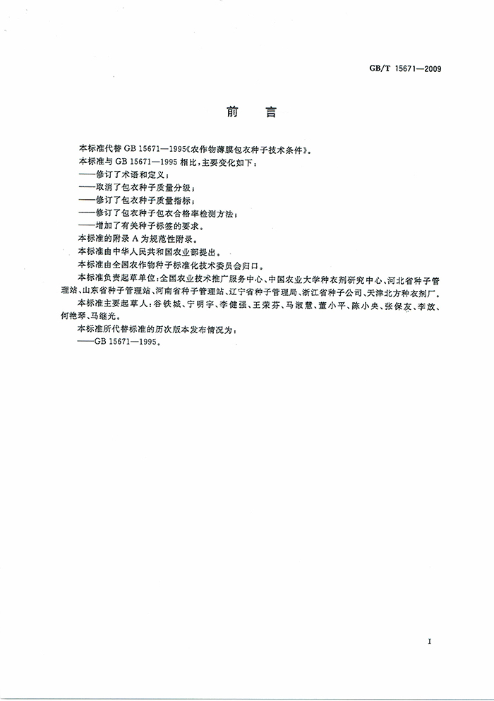 GB/T15671-2009農作物薄膜包衣種子技術條件國家標準