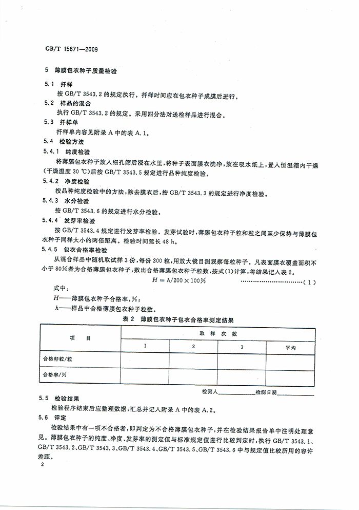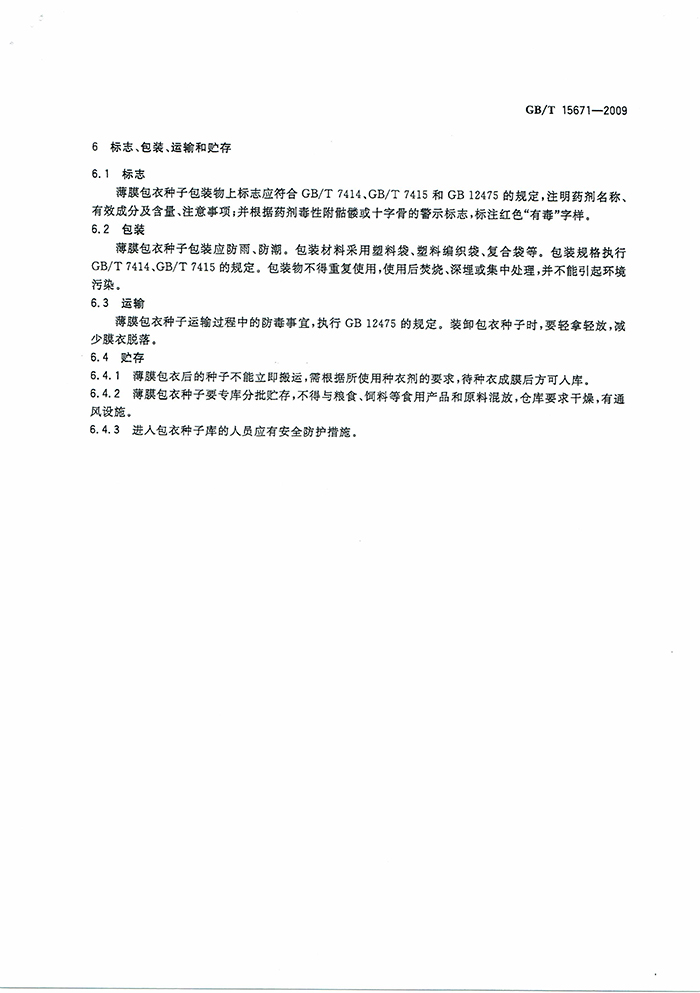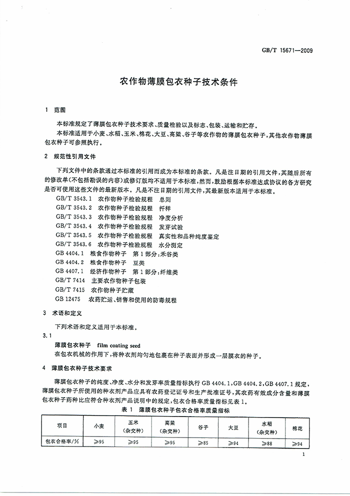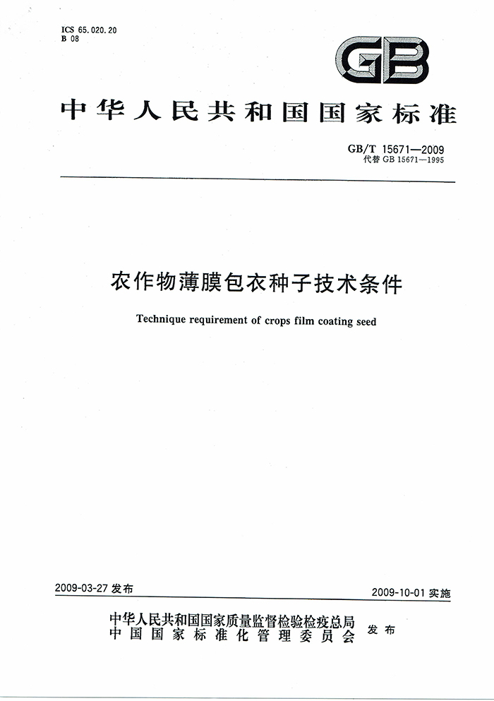 GB/T15671-2009農作物薄膜包衣種子技術條件國家標準