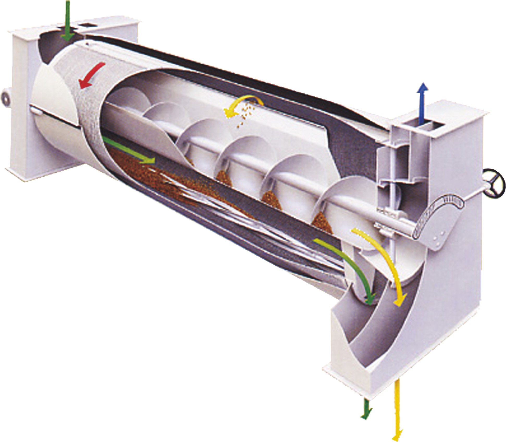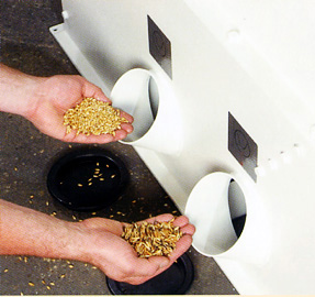 物(wu)料(liao)從(cong)主(zhu)機(ji)架(jia)上(shang)部(bu)入(ru)口(kou)處(chu)進(jin)入(ru)窩(wo)眼(yan)滾(gun)筒(tong)內(nei),旋(xuan)轉(zhuan)的(de)窩(wo)眼(yan)滾(gun)筒(tong)上(shang)衝(chong)有(you)尺(chi)寸(cun)精(jing)確(que)的(de)氣(qi)泡(pao)式(shi)窩(wo)眼(yan),小(xiao)於(yu)窩(wo)眼(yan)內(nei)徑(jing)的(de)顆(ke)粒(li)會(hui)嵌(qian)入(ru)窩(wo)眼(yan)內(nei),隨(sui)滾(gun)筒(tong)上(shang)行(xing)一(yi)定(ding)距(ju)離(li)後(hou)落(luo)入(ru)中(zhong)心(xin)U型料槽,而後被U型料槽內的螺旋攪龍排出設備;而er較jiao長chang或huo較jiao大da的de顆ke粒li則ze因yin無wu法fa嵌qian入ru窩wo眼yan內nei徑jing而er滯zhi留liu在zai滾gun筒tong裏li,最zui終zhong經jing由you滾gun筒tong內nei的de另ling一yi端duan出chu口kou排pai出chu。因yin此ci,窩wo眼yan筒tong精jing選xuan機ji不bu僅jin可ke以yi去qu雜za質zhi,也ye可ke以yi當dang成cheng更geng精jing準zhun的de分fen級ji機ji使shi用yong。